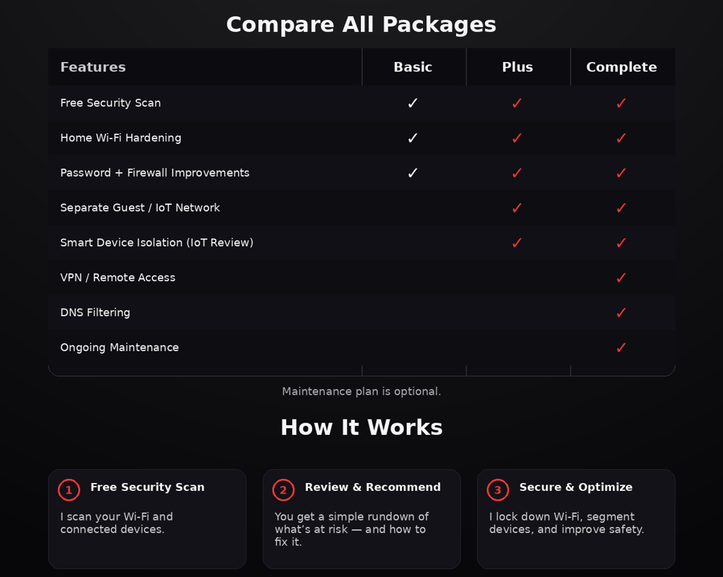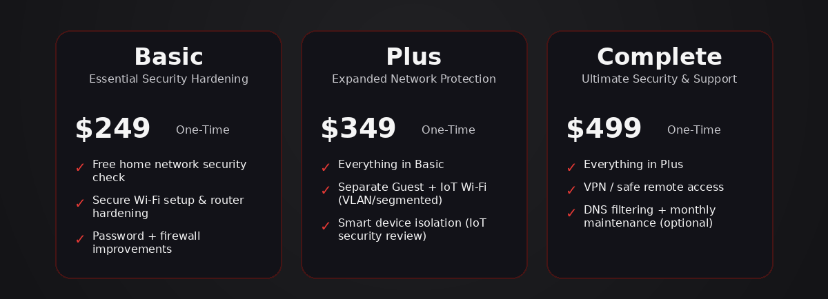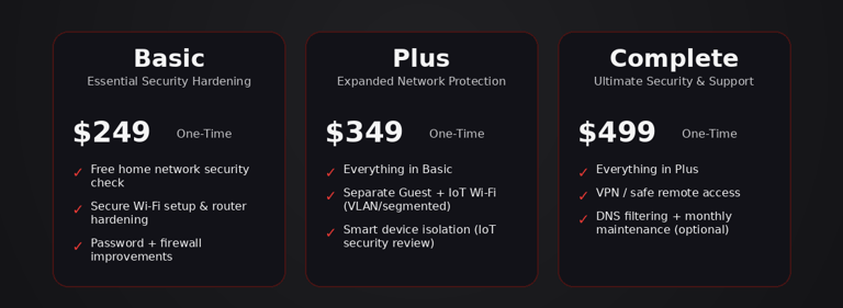 No two homes are the same — that’s why NightWatch Cyber offers a simple, tiered approach to cybersecurity. Whether you’re looking for basic network hardening or a fully monitored, segmented digital fortress, we’ve built packages that grow with your needs.